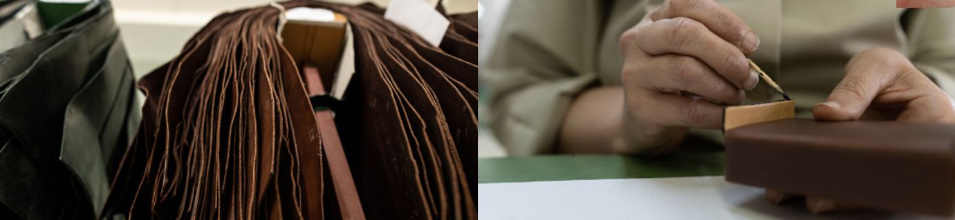 Our leather products are made exclusively from traditionally crafted and vegetable-tanned full-grain cowhide. We journey to Tuscany for our saddle leather, which retains its natural colour and is otherwise untreated and raw.